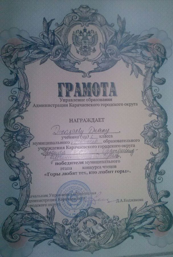 21.02 учащиеся МКОУ "СШ п.Орджоникидзевский" в муниципальном конкурсе чтецов, посвященном 100-летию со дня рождения Османа Хубиева, заняли два первых и одно третье место. Это Лайпанов Алан, ученик 3 класса-1место, Джазаева Диана, ученица 6 класса-1 место, Дудова Фарида, ученица 9 класса-3 место