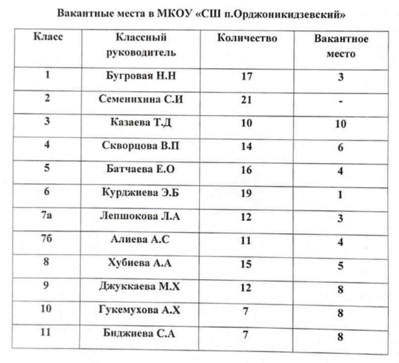 Вакантные места для приема (перевода) обучающихся